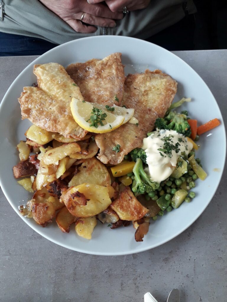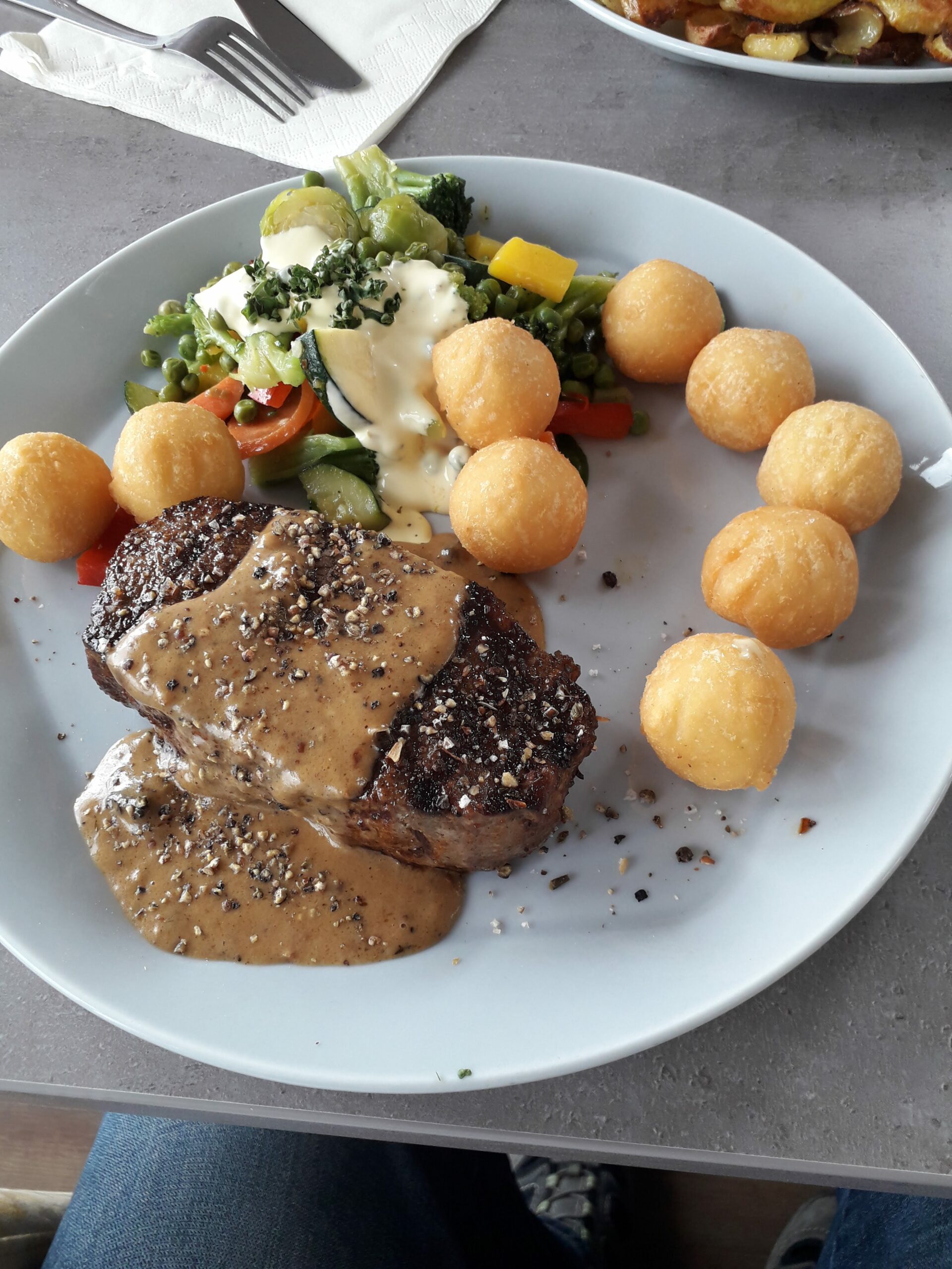 Wir waren zu dritt. Anders als sonst habe ich diesmal keinen Fisch sondern das Rumpsteak Madagaskar, ein 200g Steak mit Pfeffersoße, Kugelkroketten und gemischtem Salat bestellt.Und wenn ich so etwas mache, dann verbunden mit einer Herausforderung: „Medium rare“. Wer das kann, der kann es – und ja, der Koch kann es! Das Fleisch war perfekt. Die Kroketten in Kugelform erinnerten mich spontan an Lindt-Pralinen, nur aus Kartoffeln: Außen knusprig und innen fluffiger Kartoffelbrei, die Pfeffersoße war nicht von diesem Stern, hat aber einen verdient!
