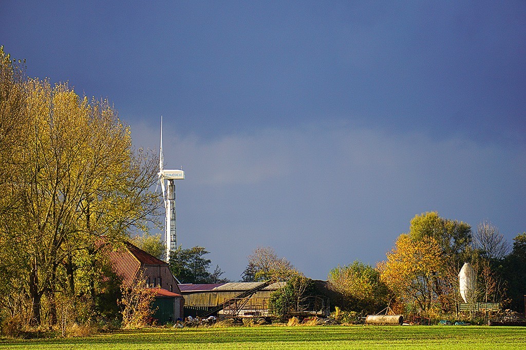 Ganz, ganz sacht steigt der Radweg aus der Polderebene an. Bei Gegenwind ein Oberschenkeltöter. Bei Gegenwind und Nieselregen eine Plage. „Sie haben so schöne Satteltaschen. Wo kann man die kaufen“, schnauft eine schwer mit Taschen beladene, ältere Radlerin zwischen Woltzeten und Campen mir nach. Ich hatte gerade so einen guten Tritt. Also kaulen. Proten, snaken, quatschen. Kann passieren. Wann kommt man schon mal nach Woltzeten. Der Weg ist schön. Einsam. Mittendrin, es ist nicht zu fassen, ein alter Gulfhof, das „Spiegelhaus“.